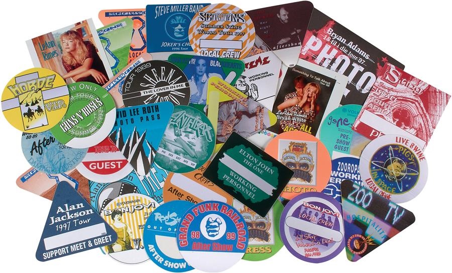 This fabulous lot of 1980s-90s unused backstage passes was obtained directly from Otto Printing & Entertainment, the company that made them and is still the prominent manufacturer of backstage passes. All are 100% authentic and almost all are rock with some country, including major acts: KISS, The Who, Pink Floyd (2), Judas Priest, Sopranos, Bruce Springsteen, Rush, Ace Frehley, Soundgarden, Aerosmith, Moody Blues, Elton John, REM, Greg Allman, Steve Miller, Van Halen, Sting, LA Guns, Santana, Bon Jovi, Willie Nelson, Grand Funk, Anthrax, David Lee Roth, Guns 'n Roses, Marshall Tucker, Michael Jackson, Cheap Trick, Bad Company, Sting, Ozzy, Run DMC, Prince, Hunter/Ronson, Phish, Squeeze, Public Enemy, Jerry Garcia, ELP, Genesis, LL Cool J, Joan Jett and many more. There is one of each pass. Many of the top bands have more than one styles and tours (U2, Michael Jackson, Prince, Santana, for example). There are some laminates and some of them are laminated. All are in unused MINT condition. Also, unused tickets of the Rolling Stones (3), Grateful Dead, David Copperfield, The Police (two different), and. Well over 200 pieces.