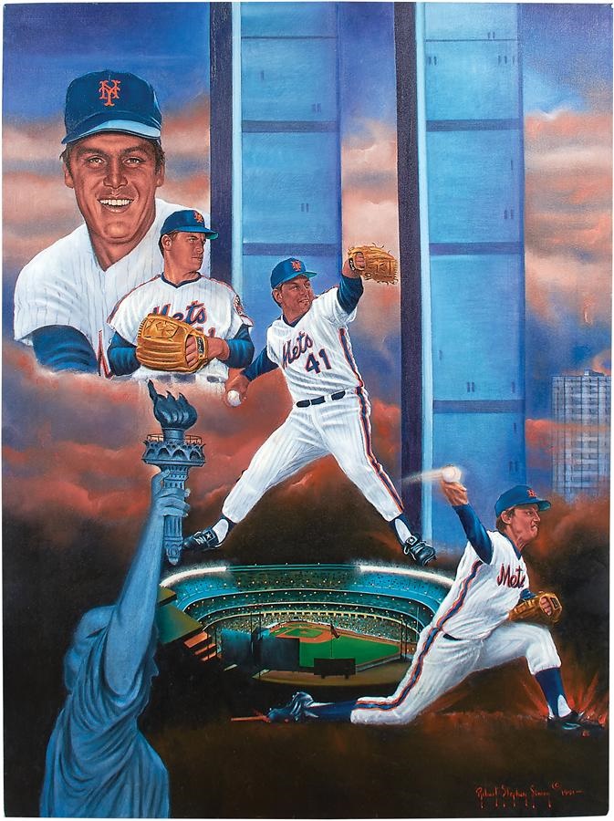 He was simply "terrific." And so is this original oil painting on canvas that salutes the first ace - and greatest pitcher ever - in the history of the New York Mets: Tom Seaver. Measuring 36x48" and signed "Robert Stephen Simon 1991" on the bottom right, the beautiful collage depicts Shea Stadium in the background, as well as Lady Liberty's outstretched torch. Seaver received the highest percentage of the vote in Hall of Fame history until Ken Griffey, Jr. eclipsed the record during the last Hall of Fame vote.