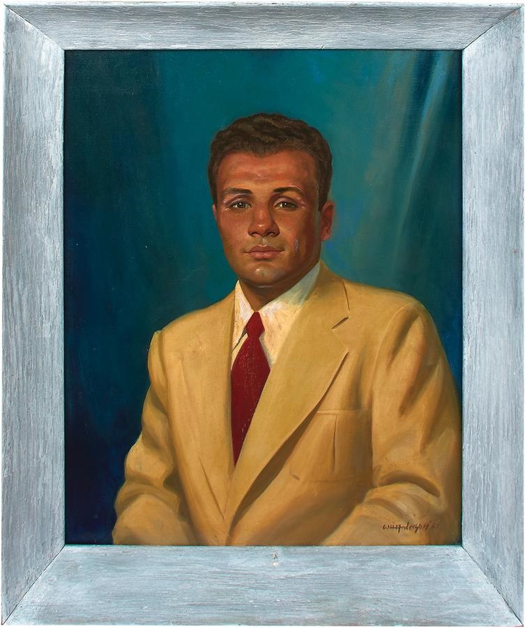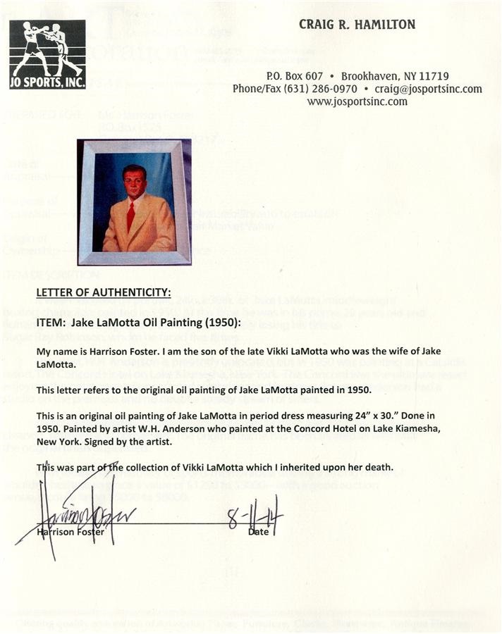 Presented here is a magnificent original oil painting of Jake LaMotta that he actually sat for at age 29. Completed in 1950 when he was World Middleweight Champion, by celebrated artist W.H. Anderson, who painted at the Concord Hotel in upstate New York. The Concord was a training site for many fighters including LaMotta. Oil on canvas with bold color and signed by artist, there are no noticeable flaws, holes or scratches. Still in original frame, cleaned, restored and conserved by Art Restoration, and their letter is included. It is marked on back by the Concord Hotel. A terrific likeness measuring 24x30". This painting was displayed at the Concord and later returned to Vikki LaMotta. Comes with a letter of authenticity from the son of Vikki LaMotta.