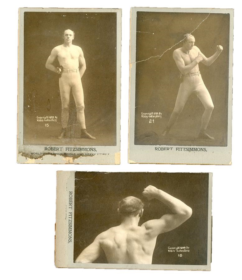 Robert Fitzsimmons was born on May 26, 1863, in Helston, Cornwall, England. He won the World Middleweight Title in 1891, the World Heavyweight Title and later he won the World Light Heavyweight Title in 1903. He retired with a final record of 43-12 with six no decisions, one no contest, and 32 KOs. Offered here is a group of three original cabinet cards of Robert Fitzsimmons issued in 1899 when he was Heavyweight Champion. Each card bares the stamp of the photographer, Klein & Guttenstein. The images are bold and clear; the card showing his back has been trimmed on one side, the one in fight pose has a crease and the third some staining at mount. The images are rare and superb.