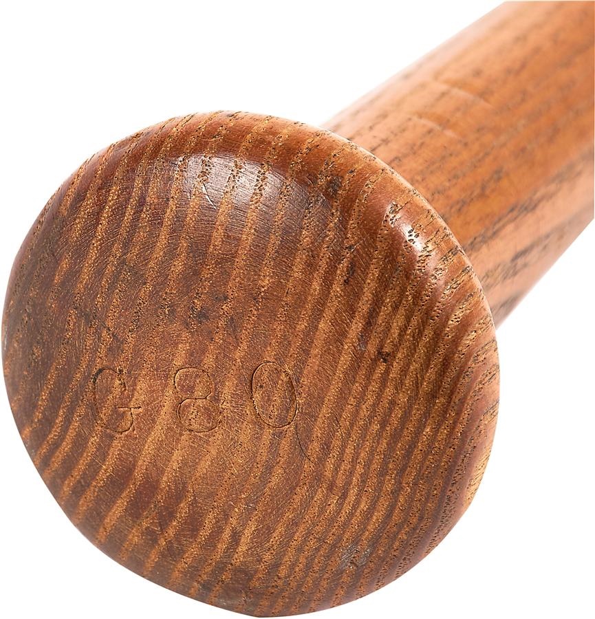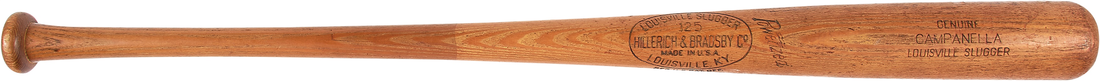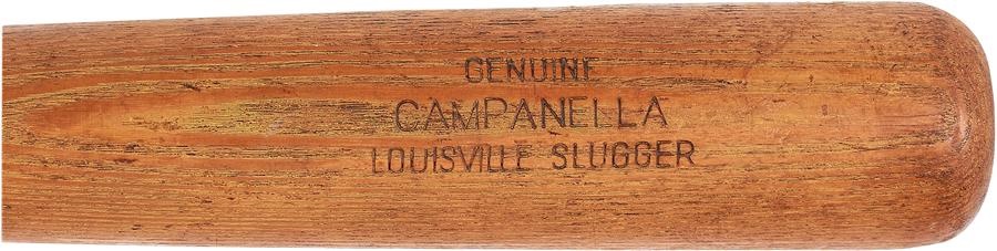 Hearkening back to the glory days of the beloved Bums of Ebbets Field, this Hillerich and Bradsby Louisville Slugger was wielded by no less than Roy Campanella. A superb example, this dark-grained bat has model G80 stamped on the knob, is 34.5" and weighs a little over 36 ounces. Campy used this very bat during his National League MVP season of 1951, which saw him crash 33 homers while driving in 108 runs. "CAMPANELLA" is boldly engraved in block letters on the barrel as these bats were only made for his use. This specimen shows nice use with grain swelling and slight wood separation on the barrel and a small crack on the handle. Comes with PSA LOA and graded an 8. Roy's 1951 MVP was the first of three he was to earn in a career and life that exudes strength and bravery against the elements of survival.