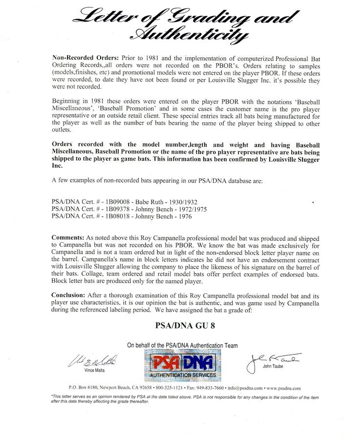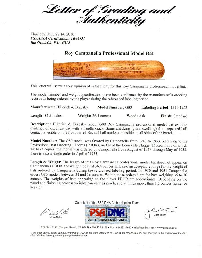 Lot # 518: 1951 Roy Campanella "MVP" Game Used Bat (PSA 8)