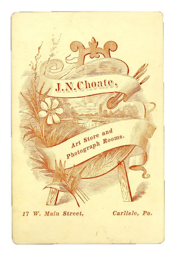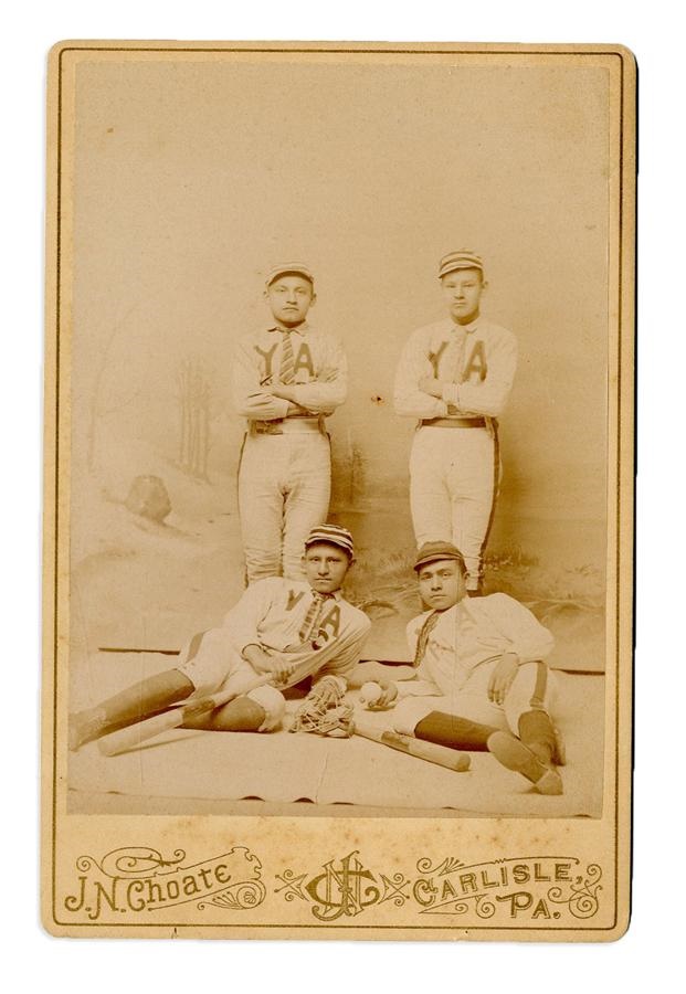 This is a stunning high-grade cabinet card of four Native American students of the Carlisle Indian Industrial School, later home to Jim Thorpe. This truly rare find is in near pristine condition, with perfect detail, resolution and balance of light. By J.N. Choate a master lensman and the principal photographer for Carlisle his name is synonymous with the school. His works are now in the annals of history, kept at the Smithsonian and the glass plate negative from this very image can be viewed in their database (see below). The Carlisle Indian Industrial School operated in Carlisle, Pennsylvania, from 1879 through 1918 and of course produced sports icon Jim Thorpe. Except for a pinprick on bottom the cabinet card is a gorgeous NRMT and measures 4.25x6.5". At the height of political incorrectness, the "YA" on their uniforms stands for "Young Indians." The only specimen known to exist, even the Smithsonian does not have a print, only the negative. (NOTE 1: The negative in the Smithsonian can be viewed here: http://siris-archives.si.edu/ipac20/ipac.jsp?session=127RV45821A22.83921&limitbox_1=LO01+=+naa&menu=search&aspect=subtab157&npp=50&ipp=20&spp=20&profile=all&ri=1&source=~!siarchives&index=.GW&term=baseball+Carlisle,&aspect=subtab157&x=8&y=8#focus) (NOTE 2: The "YA" is referenced as "Young Indians" in the book "The American Indian Integration of Baseball") By Jeffrey P. Powers-Beck. Here is the link to it: