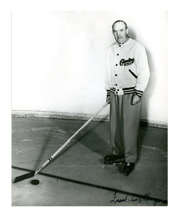Having spent over six decades in hockey, this great 8x10" inch black and white photo captures Frank "King" Clancy during his stint as coach for the Cincinnati Mohawks in 1949. The photo is in Very Good condition and includes a signature in in black fountain ink, "Frank King Clancy," which is on a somewhat dark portion of the photo but clearly legible and rates 7.5/10.