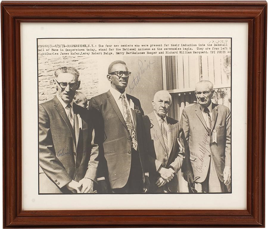 A true classic, this 1971 wire photo pictures Hall of Fame inductees Chick Hafey, Satchel Paige, Harry Hooper, and Rube Marguard. All four have signed, making this a very rare piece. The photo is matted and framed to 12x8" and appears EX while the signatures rate 6/10. Paige holds the distinction of having been the first player from the Negro Leagues to be inducted into baseball's hallowed halls.