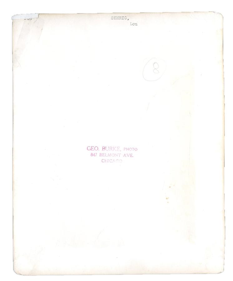 This great, 8x10" black and white photo of Yankee legend Lou Gehrig originated from the lens of George Burke. The glossy photo is very clear and from the 1930s, printed from the original negative with Burke's stamp on the verso along with a number "8" circled lightly in pencil. It has some creases and a tear (repaired with tape) at the upper right hand corner.