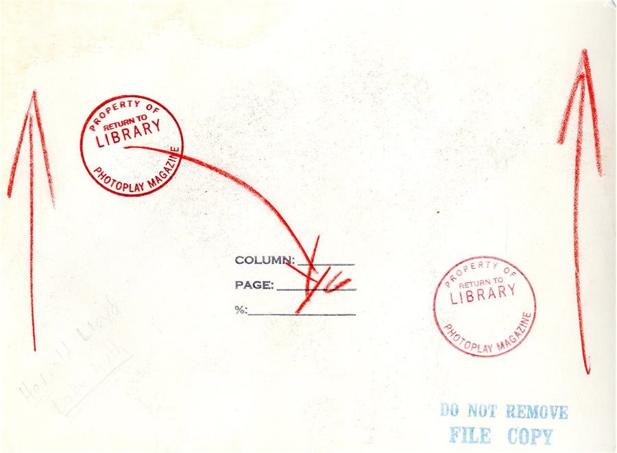 This fantastic original photograph dates from the 1930s and depicts legendary Babe Ruth and silent film star Harold Lloyd, pictured on the set of a movie with both in suit and tie. This 9.25x7.25" black and white snapshot remains in EX condition with a strip of mounting tape on the verso, along with Photoplay Magazine (File Copy) stamps and several other marks.
