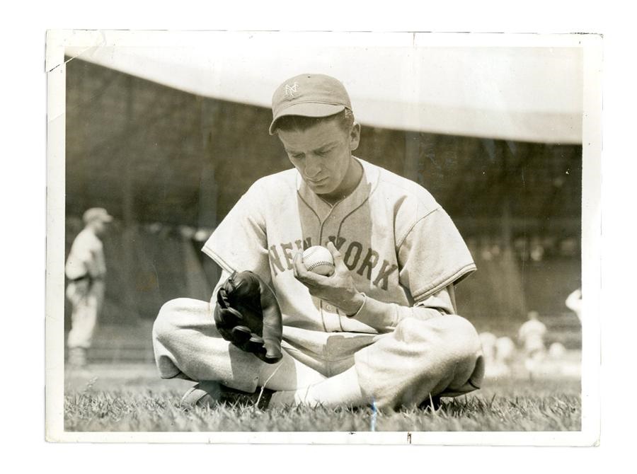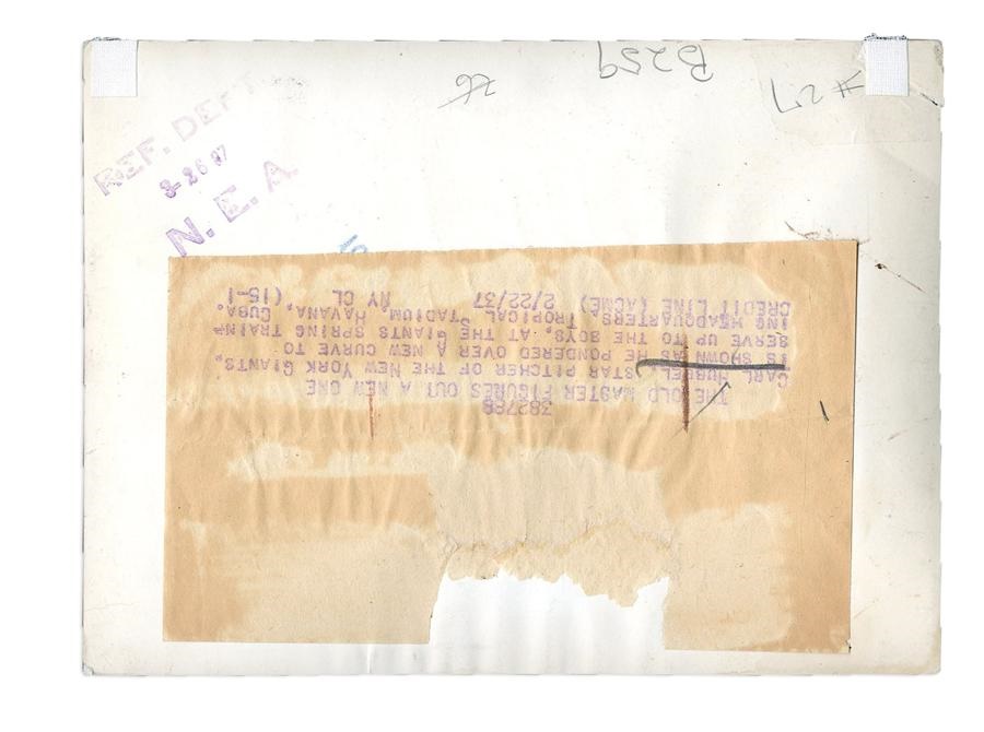 In this great vintage 1937 photo, Hall of Famer Carl Hubbell sits apparently transfixed by a baseball at New York Giants Spring Training. The 8x6" black and white photo includes a wire caption dated 2/22/37 on the verso along with N.E.A. stamp. It stands in VG condition with a tear at the upper left corner and small pieces of mounting tape on the back.