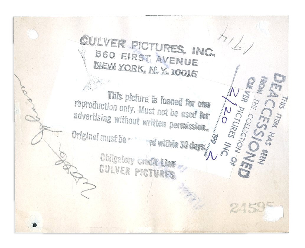 From the archives of Culver Pictures - which exists to this day - comes this vintage photo. Identified on the verso with vintage pencil writing "Walter Johnson 1914" along with several Culver stamps and with deaccessioned date and stamp, it measures 4.75x3.5" and is in VG condition with a pin sized hole at bottom right corner.