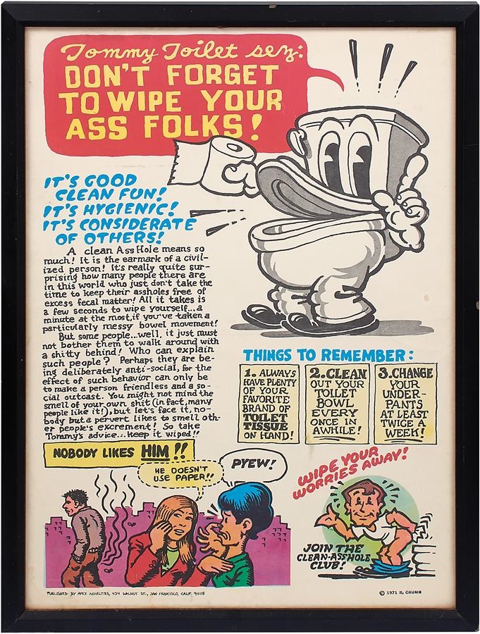 The infamous underground poster that graced the bathroom walls of thousands of hippie apartments during the 1960s has become a vintage rarity. 'Don't forget to wipe your ass, folks!' measures 15x22" and is in EX-MT condition. Cartoon art by the infamous Robert Crumb, this window card style of poster is a medium stock and nicely framed. Published by Apex Novelties, with a San Francisco address.