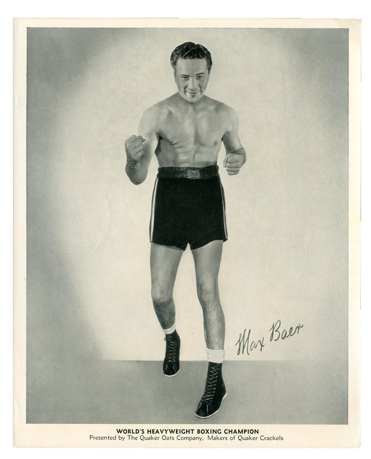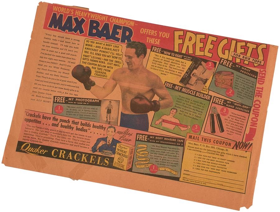 This is a premium set from 1934 following Max Baer's June 1933 victory over Germany’s Max Schmeling at New York’s Yankee Stadium. Schmeling was said to be a favorite of Germany’s new chancellor, Adolf Hitler, so it carried special meaning that Baer was of Jewish heritage, and wore on his boxing trunks a Star of David. Lot includes the 11x15.5" newspaper full color page with the cereal premium mail-in-coupon, facsimile signed 8x10" photo print and the original envelope from Quaker Oats. Overall condition is EX-MT for this rare historic ensemble.