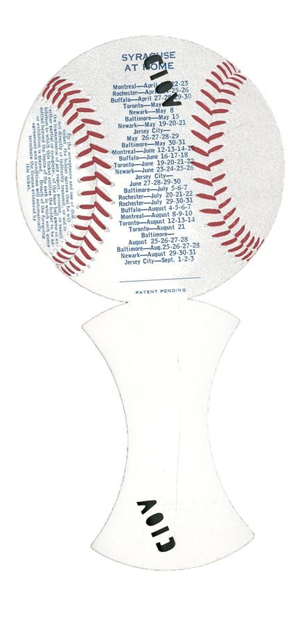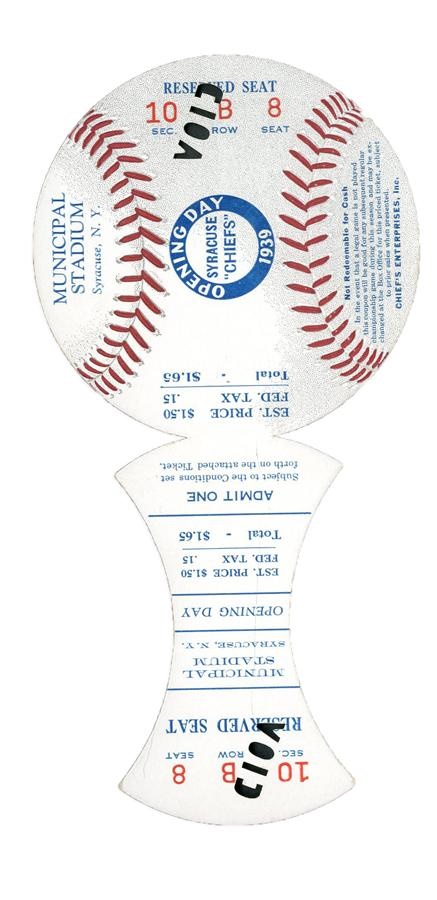 Long before Syracuse University was the top sporting attraction in Syracuse, New York, the Chiefs were the team that drew the most attention in the Salt City. From the sixth season in club history, this unusually shaped opening day ticket from Municipal Stadium is full and unused but stamped "Void." The top of ticket is die-cut and printed like a baseball. It is in EX-MT condition but for void punches. Like today, the 1939 Chiefs played in the International League. But unlike that unaffiliated season, the Chiefs are now the top farm club for the Washington Nationals.