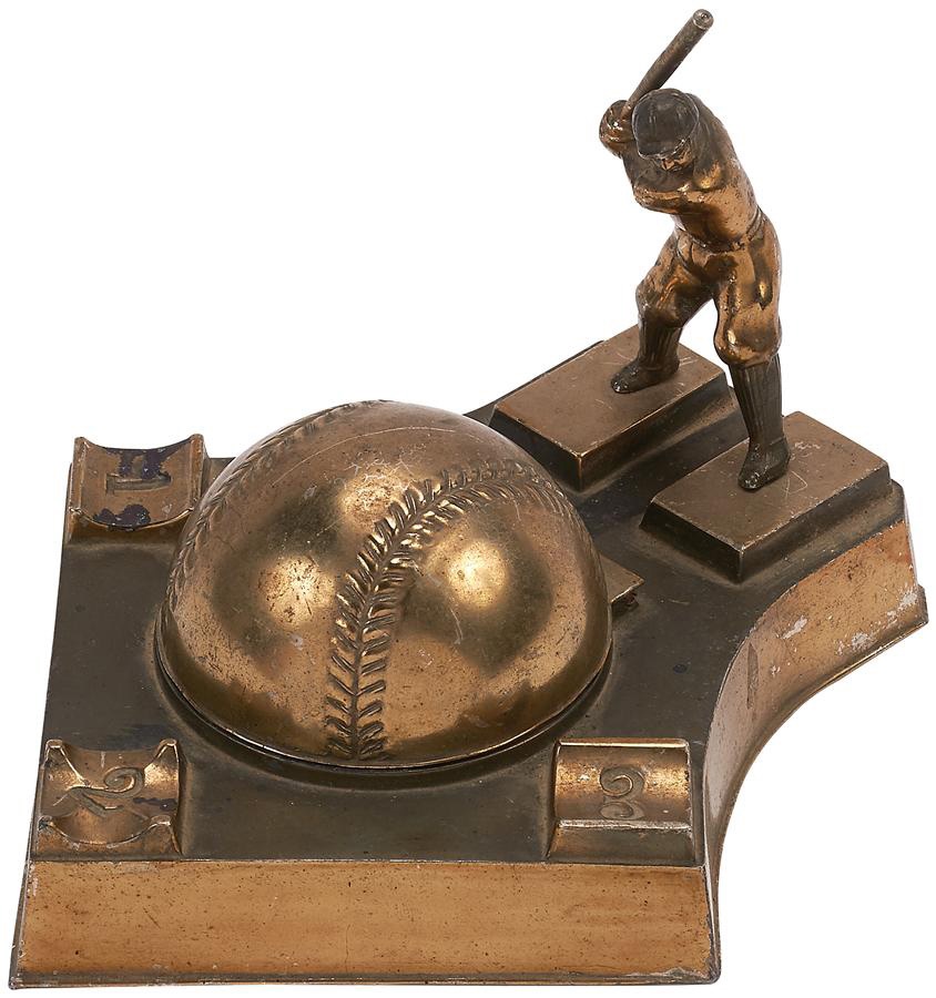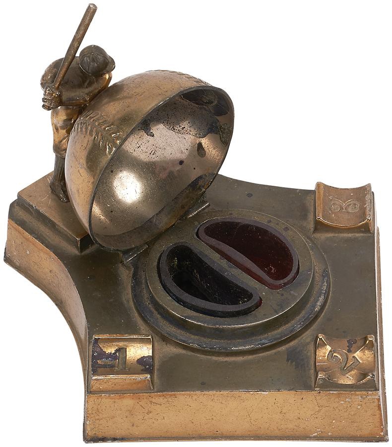 This baseball inkwell made of metal, discovered in Japan, displays a standing player (3.5") intended to be Babe Ruth. Comes with the original fitted and hinged heavy duty box, and the piece incorporates a pen holder, with a baseball diamond and baseball that lifts up to reveal two glass inserts to hold the ink. This was influenced by Ruth's celebrated trip to Japan in 1934. Inkwell measures 5.5x6" and has some wear, minor dings and scratching.