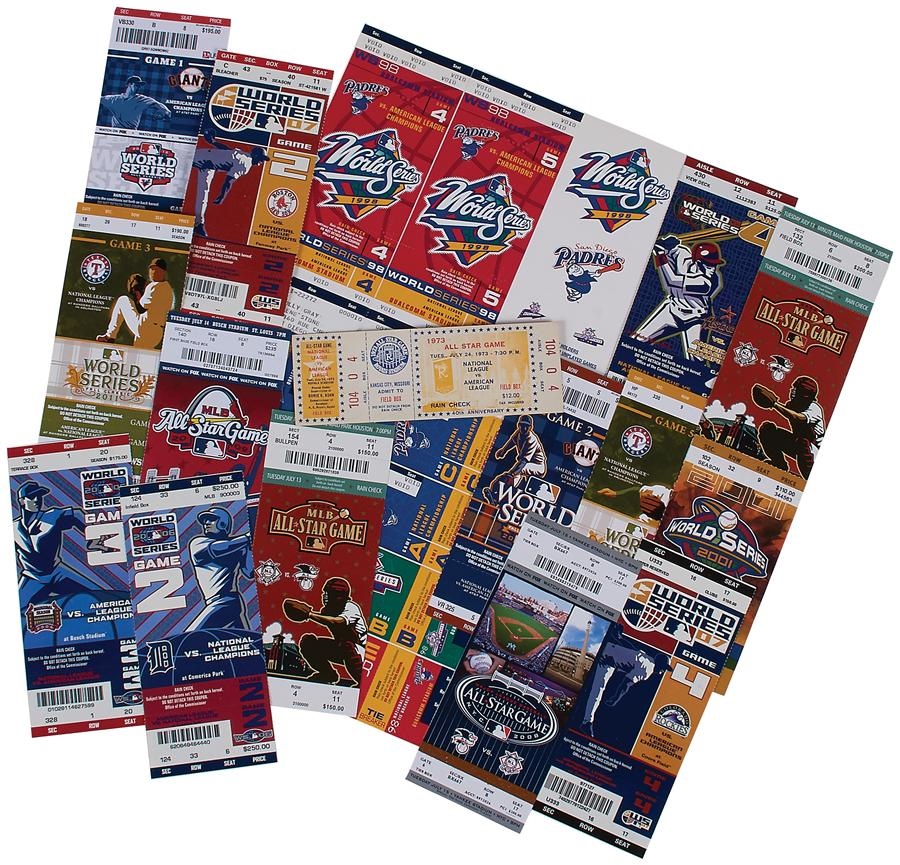 All tickets in this grouping are in NM condition. WORLD SERIES: 1-14) 1998 San Diego Game 4 & 5 two of each. Plus, LCS, LDS and Tie Breakers, two of each (10). 15) 2001 Game 7 Arizona, 16) 2005 Game 4 Houston. 17) 2006 Game 2 Detroit. 18) 2006 Game 3 St. Louis, 19) 2007 Game 2 Boston, 20) 2007 Game 4 Colorado, 21) 2008 Game 1 Tampa, 22) 2008 Game 2 San Francisco, 23) 2011 Game 5 Texas, 24) 2011 Game 1 San Francisco. All Star: 25) 1973 Kansas City, 26-27) 2004 Houston (2), 28) 2008 New York, 29) 2009 St. Louis, 30) 2010 Anaheim.