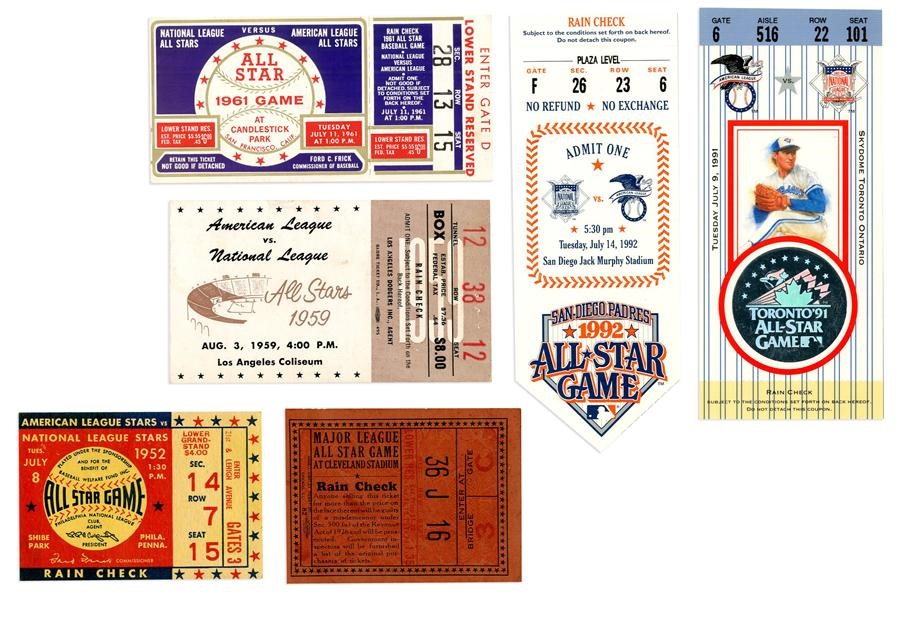 A nice selection of stubs from various games; 1) 1935 Cleveland GOOD to VG, 2) 1952 Philadelphia VG+, 3) 1959 Los Angeles EX, 4) 1961 San Francisco NM, 5) 1992 San Diego NM, 6) 1991 Toronto NM.