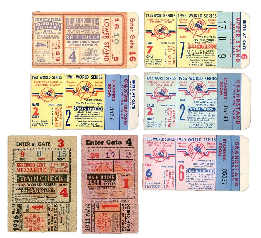 YANKEE STADIUM: 1) 1936 Game 4 EX+, 2) 1941 Game 1 VG+, 3) 1961 Game 2 EX, 4) 1955 Game 2 NM, 5) 1955 Game 7 EX+, 1955 Game 6 NM. EBBETS FIELD: 1941 Game 4 VG.