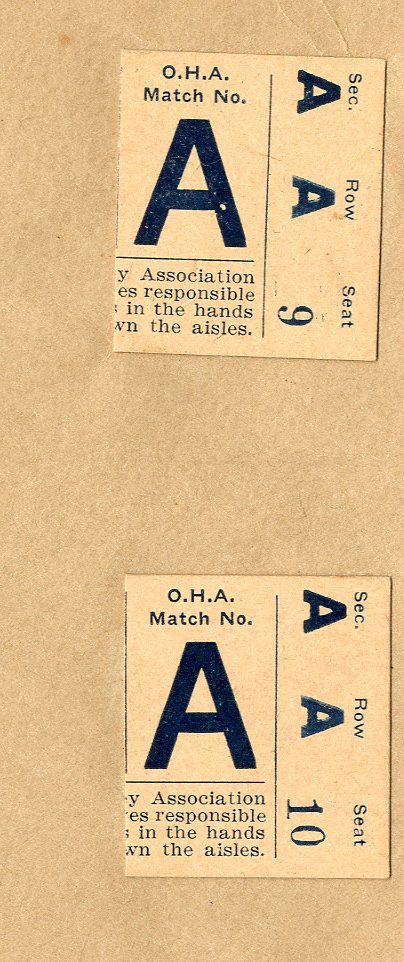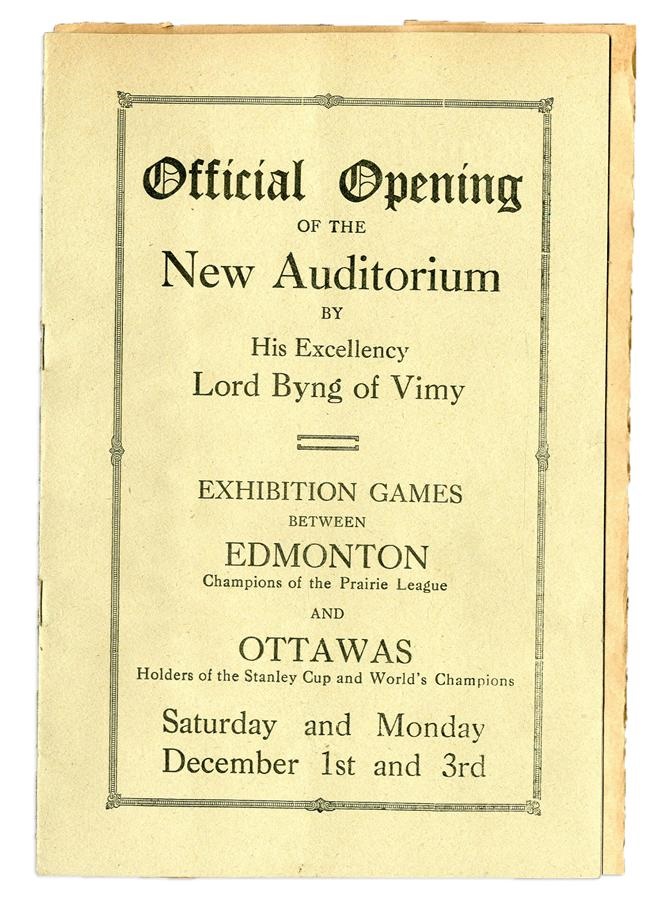 Long before the current NHL Ottawa Senators franchise existed, a minor league club with the same nickname played in a newly-opened, state-of-the-art venue in 1923. This program and two ticket stubs come from the first-ever exhibition game at the Ottawa Auditorium. All are affixed to a brown-paper backing but appear EX other than being affixed. The game was between the Edmonton Club and World Champion Ottawa Senators. Names like Boucher, Broadbent, Denneny, Nighbor and Clancy are on the lineup page. The fact that the building's seating capacity was 10,000 was quite unusual for its time, especially in a relatively-small market such as Ottawa (despite its political importance). Not only did the community use the auditorium for hockey, there were numerous assemblies, performances and concerts held there, making it a true community and cultural center.