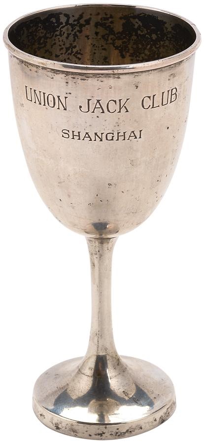 This lovely silver trophy cup was awarded at the Shanghai branch of the British armed services Union Jack Club, probably in the late 1920s. In EX condition, it weighs 47 grams of silver with hallmarks in the base, and measures 4.25" tall.