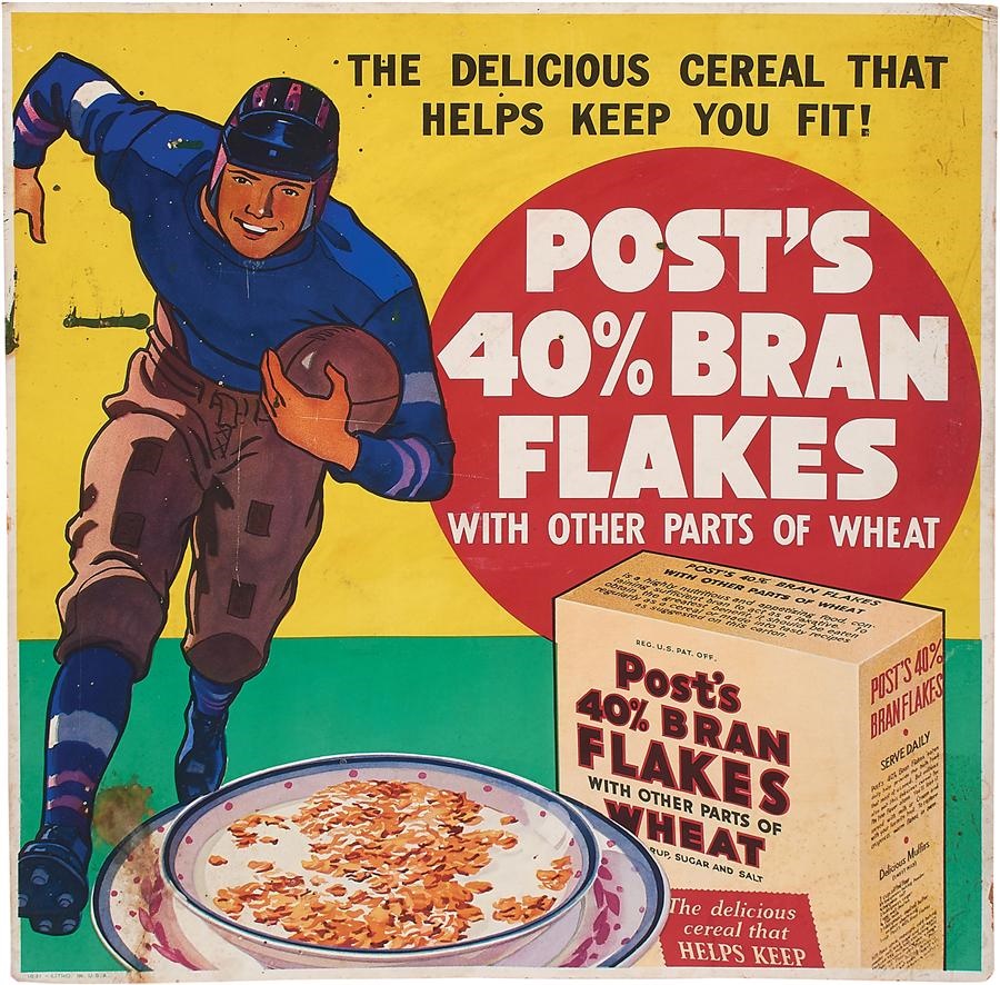 The marvelous graphics in this vibrant ad for Post's 40% Bran Flakes are in the "school" of 1935 National Chicle Football Cards of the earliest superhero comic books. There are some paint stains but otherwise displays nicely. What's especially great is that cereal advertising puts it in the "school" of old bubble gum cards and radio premiums. A perfect pop culture addition to your collection, it measures 22" x 22".