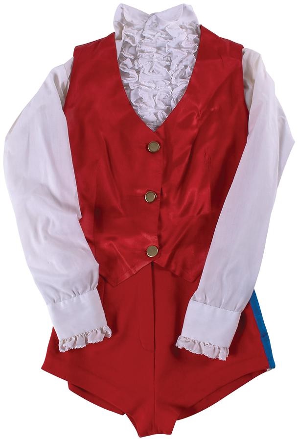 Go team, Go! This cheerleader's uniform comes with the jumper (looks like it came right out of a classic episode "Wide World of Sports,") plus ruffled shirt and satin vest (ala Laurie Partridge of the Partridge Family). Issued by the Buffalo Bills, this was worn and OBTAINED DIRECTLY from Bills cheerleader Carol Missel of East Aurora, New York. She became a Buffalo Jill in 1973, Co-Captain in 1976 and worked the sidelines until 1979. In beautiful clean condition and worn with pride, it comes with full color 5x7" Type I vintage game action photo (also from lovely Carol) showing Missel wearing this very piece with her attractive teammates on the sidelines.