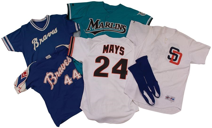 Neat stuff with various levels of use: 1) Willie Mays coaches' jersey with "1989 24" tagging by Rawlings (size 44), signed on front in blue Sharpie. 2) Florida Marlins #88 aqua mesh jersey is Russell size 44. 3) 1970s Hank Aaron Sand-Knit size 42, with 44 on front and back, is a nice knit salesman's sample with leggings. 4) 1970 gray flannel major league pants size 34. 5) San Diego Padres mesh jersey with #64 on verso, Majestic size 46. 6) 1990s Atlanta Braves minor jersey with #57 on verso.