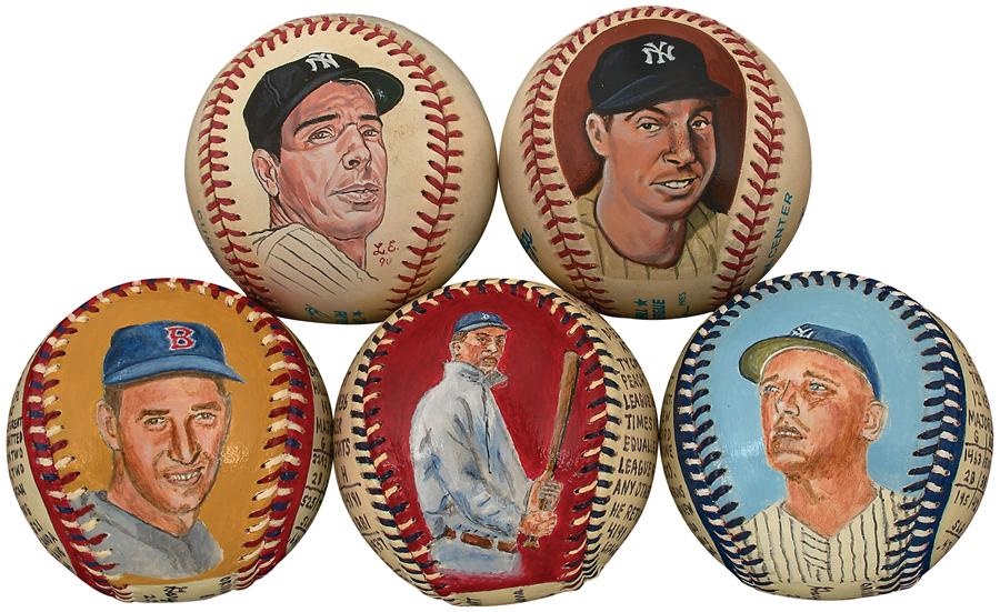 Giving new meaning to "the art of baseball," these five beauties tell stories in word and image. Three are full color renderings of Ty Cobb, Roger Maris and Ted Williams, by artist Gary Guerra - all are signed by him and dated 2008. The other two are of Joe DiMaggio; one done in 1990 with artist initials "L.E." and the other is not signed by the artist. Each displaying stunning detail in its own fashion, all are in EX-MT condition.