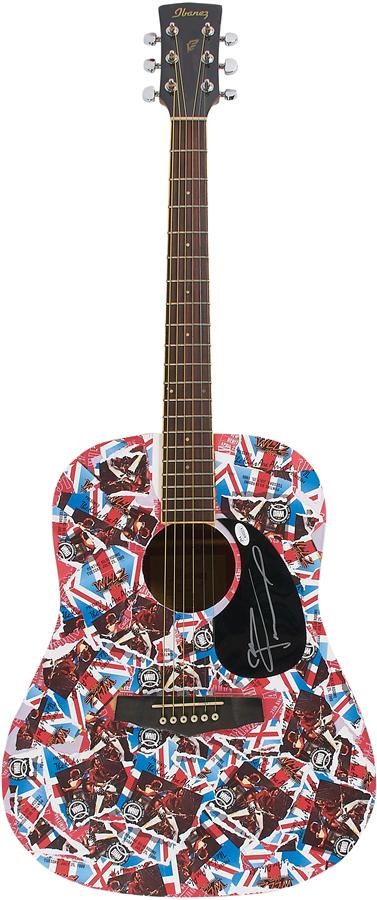 Created by our own Joshua Leland Evans, Chairman of Lelands.com, this is entitled "The Kids Are All Fight" a nod to the infighting within The Who and their violent "Mods" past. It is a play on words of their early hit single "The Kids Are Alright," the same later serving as title for their 1979 rockumentary and decade later tour. Dedicated entirely to Townsend and The Who, this marvelous art piece is laid down with a network of red Union Jack color and then carefully adorned with rare roughly torn pieces of a one of a kind backstage pass uncut proof sheet that is printed on regular paper rather than the silken resin that's normally used for backstage passes. The sheet is from their 1989 "The Kids Are Alright" tour. The Ibanez acoustic guitar (plays perfectly) is a nice quality instrument and the pickguard is anointed with a NRMT signature in decadent silver of rock icon Pete Townsend of The Who with JSA LOA. This is one of about ten that Evans has so far completed and it is signed and dated (2/2016) by the artist along with the title "The Kids Are All Fight." All of the passes are 100% vintage originals obtained directly by Leland's from the archive of Otto Printing and Entertainment, the dominant force in printing concert backstage passes and tickets still to this day.
