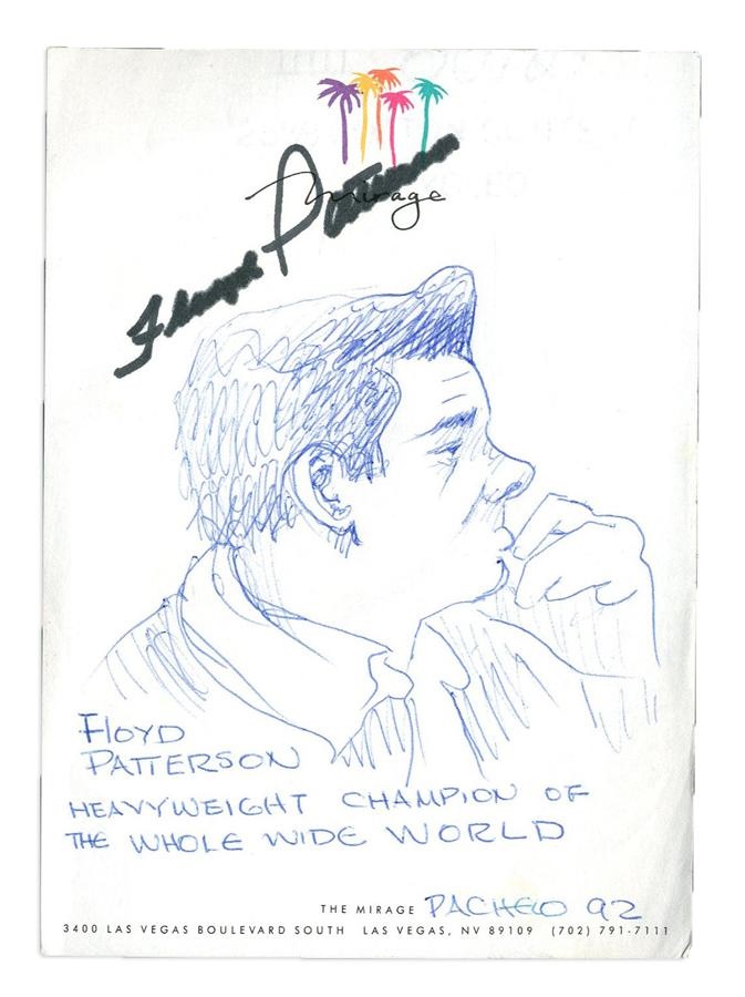 A quirky find, this ink drawing on Las Vegas "Mirage" stationery is by accomplished artist and Muhammad Ali fight doctor Dr. Ferdie Pacheco. This came directly from the Floyd Patterson Estate and is signed by Patterson in black Sharpie. The nice study is 5x7" and is signed "Pacheco '92." In EX-MT condition.