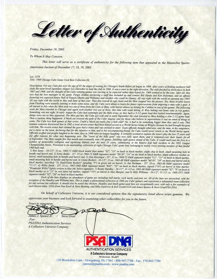 They may not have won any pennants, but from 1967 to 1972, the Cubs were consistent National League contenders, with winning records in each of those seasons. Here are five game-used bats from that era that belonged to: Don Kessinger, Randy Hundley (signed), Willie Smith (signed), Jim Hickman and Glenn Beckert (signed). All have their numbers written on the knob except Hickman's. PSA LOA included.