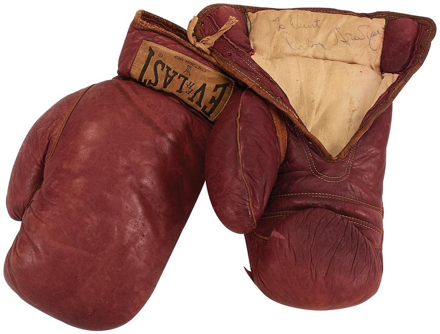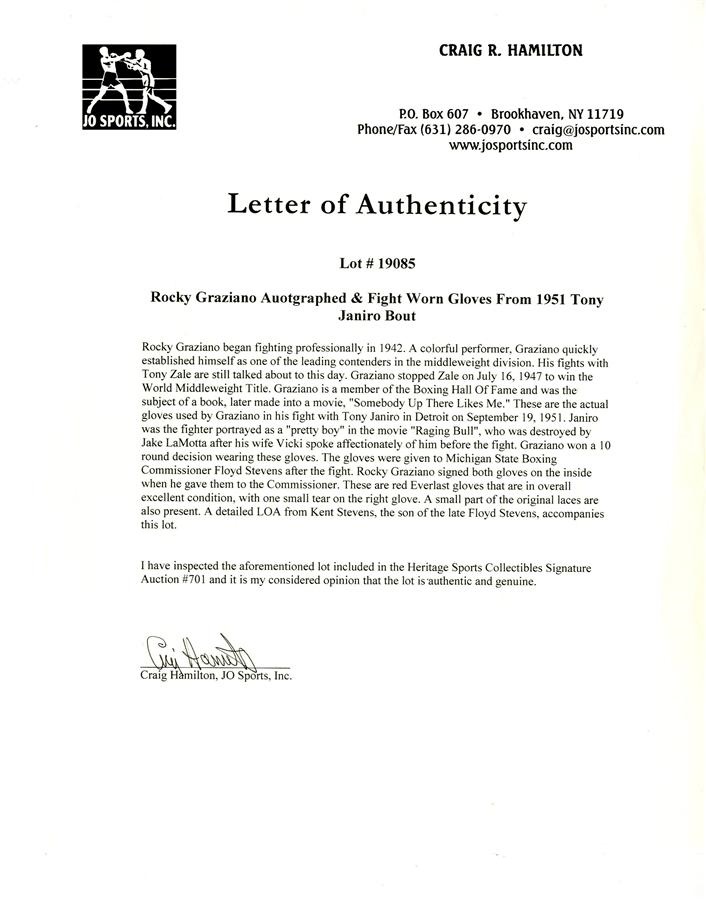 Middleweights Tony Janiro and former champion Rocky Graziano fought in the main event on September 19, 1951, in Detroit, with the colorful Graziano winning a 10-round decision. We offer here the actual fight worn gloves used by Rocky Graziano, which were given to the boxing commissioner in the State of Michigan, Floyd Stevens, following the fight and which were both signed inside the wrist by Graziano. These are Everlast manufactured gloves in nice condition with one small tear on the right glove. A small part of the original laces remain present. The gloves come with a detailed LOA from Kent Stevens, the son of the late Floyd Stevens, a letter from boxing expert Craig Hamilton and an LOA from PSA/DNA on the Graziano autographs.