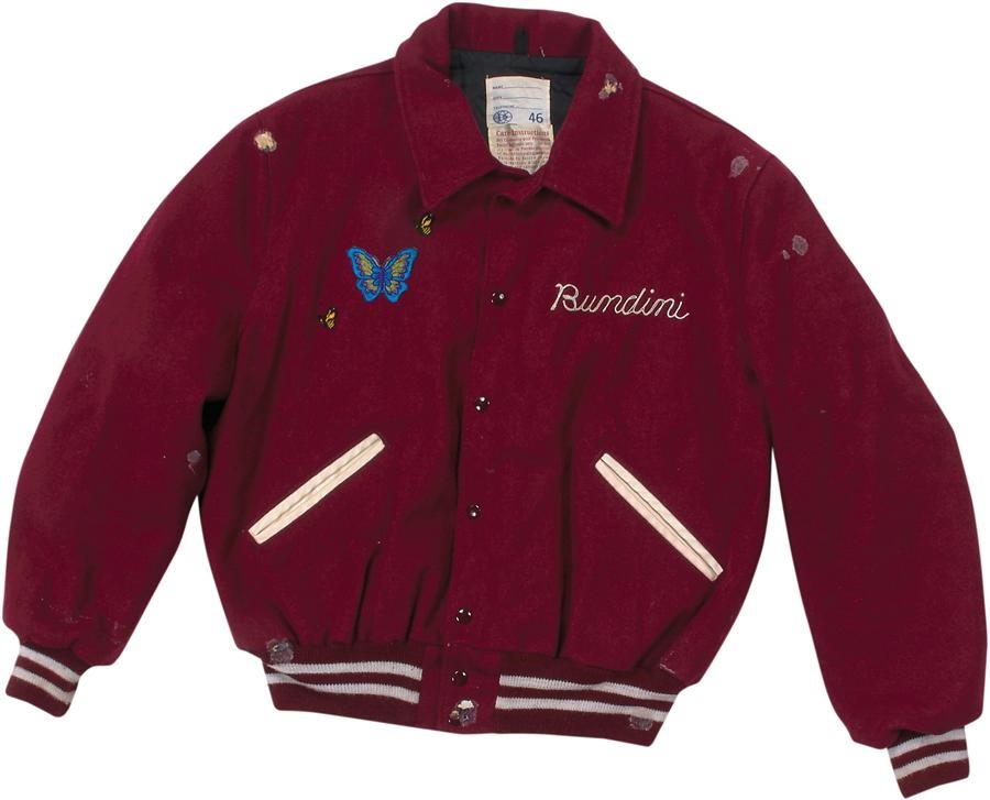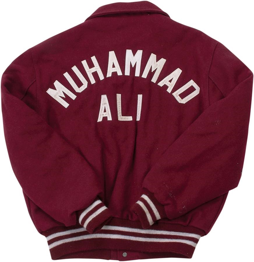 This is an original wool jacket used by famous Muhammad Ali cornerman and cheerleader, Drew "Bundini" Brown. Burgundy color, this long sleeve, wool jacket has the name MUHAMMAD ALI sewn on the back in block lettering and the name BUNDINI sewn on the front left breast in script. On the front right breast are two small bees and a butterfly to signify the famous expression of Bundini Brown, "Float Like A Butterfly And Sting Like A Bee." Approximately ten glue stains are on the front from frame mounting, otherwise in Excellent condition.