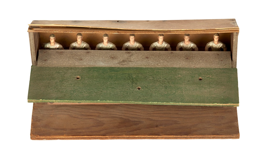 An intriguing piece that originates from the Cincinnati Area, this mock dugout utilizes early baseball game pieces and creates the illusion of an actual baseball bench. The one-of-a-kind artwork features original paint, wood and cast iron figures. It measures 11x5x6" and is a cool curio for baseball collectors and those who appreciate American art. There is some chipping along the wood roof, though that may be intentional by the artist.