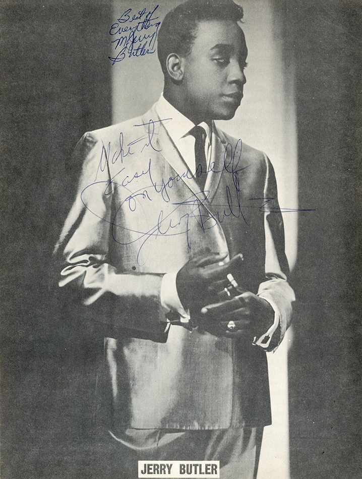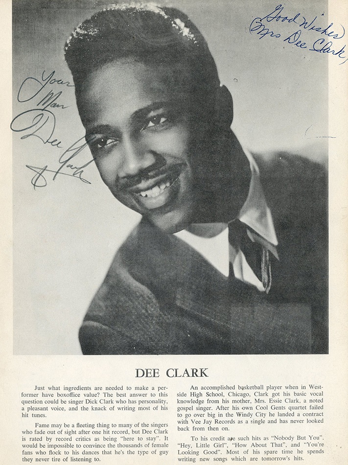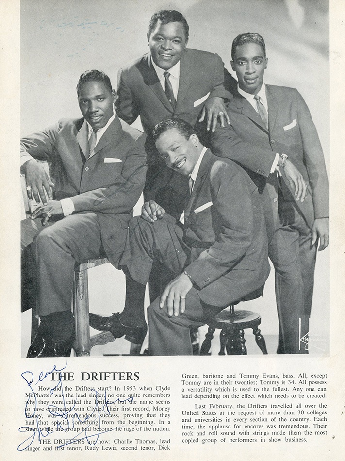From the year of the famed Harlem Square Show, signatures were all obtained at the time by a tour "insider." Nearly complete, the signatures include the key tour members and even some of their wives. Absolutely magnificently done, all signed right on their large photographs: 1) Sam Cooke front and center on page one. 2) Huge, "Make It Easy On Yourself Jerry Butler" with his wife as well. 3) "Your Man Dee Clark" and wife. 4) "Gene" (Pearson) The Drifters". 5) Signed by all four of the magical "Crystals." 6) A young Dionne Warwick. 7) Plus, signed by Johnny Thunder, Little Julius High, Gorgeous George, Little Esther Phillips, Clifford Burks and Lee Moses. The book itself is strong VG-EX, signatures are NRMT-MT with some in pencil, and the all-important Sam Cooke in ink. Not his wife of course, he was shot by a jealous man.