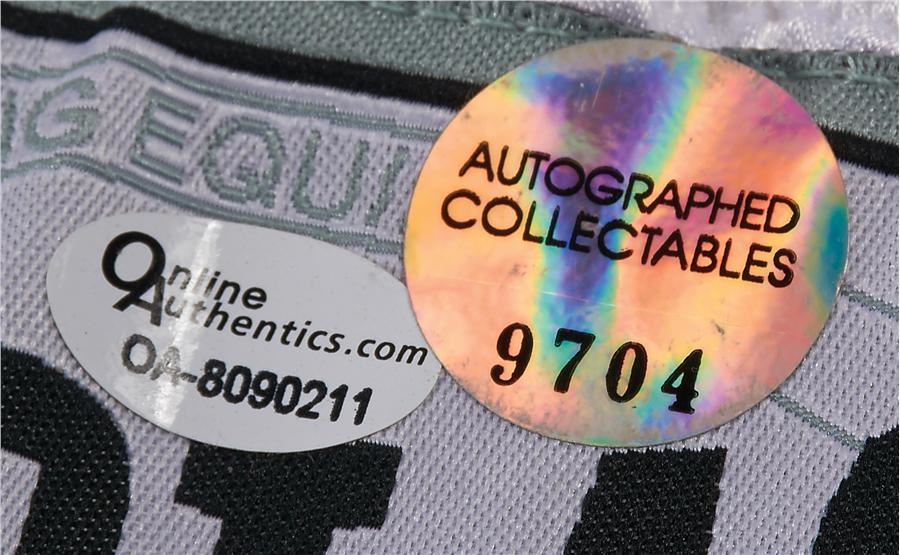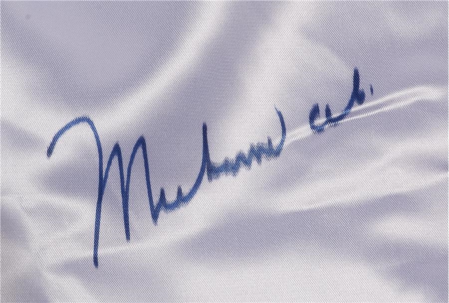 A pair of white satin boxing trunks sporting an Everlast manufacturing label, these have been boldly signed in blue Sharpie by Muhammad Ali. The trunks are size medium and show no noticeable flaws, and come with a hologram and COA from Online Authentics, the company of Muhammad Ali's autograph agent. You will not find a better pair signed by the champ.