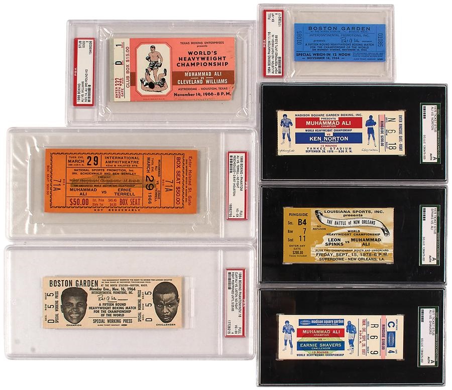 Here's a terrific group of seven graded tickets from different events featuring former World Heavyweight Champion Muhammad Ali. Group includes a full weigh-in ticket for the postponed second Liston fight in Boston on 11/16/64 (PSA/DNA EX-MT-8), a stubless ticket for Ali-Norton III in 1976 (SGC-A), a stubless ticket for Ali-Spinks II in 1978 (SGC-A), a stubless ticket for Ali-Shavers in 1977 (SGC-A), a stubless ticket for Ali-Williams in 1966 (PSA/DNA-Good-2), a full ticket for Ali-Liston II in 1965 (PSA/DNA-VG-EX-4), and a full ticket for the postponed Ali-Terrell fight in 1966 (PSA/DNA-VG-EX-4).