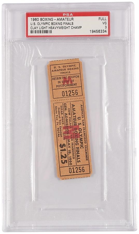 Future Olympic champion Cassius Clay fought Henry Cooper in the first section of the Eastern Regional Light Heavyweight Olympic Trials on May 18, 1960, in San Francisco. Clay dominated this fight and knocked out Cooper (some reports listed him as Hooper) in the 3rd and final round. Offered is a PSA/DNA authenticated ticket from this event. PSA/DNA has graded the ticket as VG-3 and we concur. Scarce Clay ticket on the way to the Olympics.