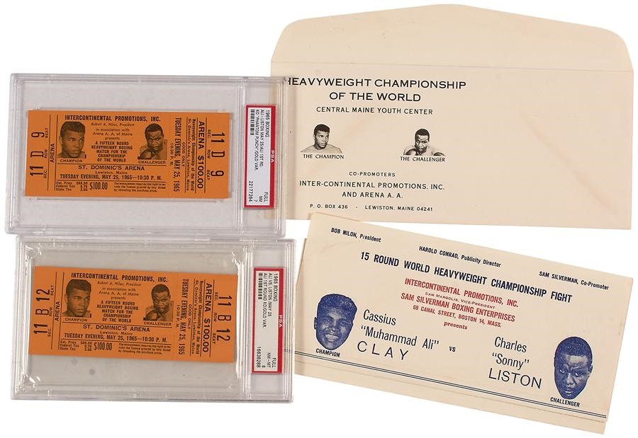 The Ali-Liston II fight on May 25, 1965, in Lewiston, Maine, is the most controversial fight in the career of Muhammad Ali. Knocking out Liston in the first round was seen as almost impossible by most observers and many think to this day Sonny was in the tank. Offered here are two, full, unused, on site tickets for this event, which picture both fighters. Authenticated by PSA/DNA and given high grades of 8 and 7, making these both scarce and desirable. Also included is a rare illustrated envelope which advertised the fight (EX).