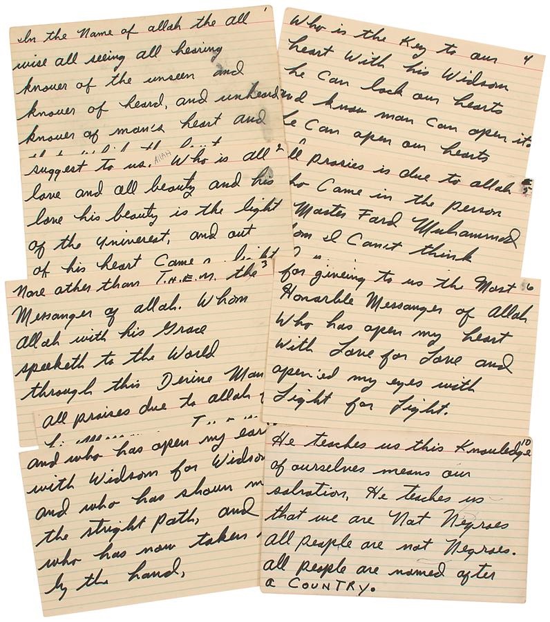 Muhammad Ali, formerly Cassius Clay, converted to Islam in 1964, shortly before his historic first fight with Sonny Liston. Ali has remained to this day devoted to and passionate about his religion. Starting in the 1960s, Ali made many speeches regarding his religion and we offer here a 22-page speech written in hand by Muhammad Ali to that purpose, mentioning Allah and Islam. The speech has numbered pages 1-to-23 with page 9 missing. Written in black marker, the speech has been authenticated by PSA/DNA and comes with their full letter of authenticity. The last page has some water damage. The early writings of Muhammad Ali rarely surface and are always highly desired.