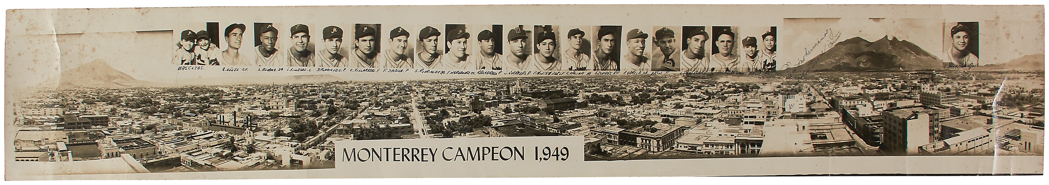 Originally obtained from the family of Monterrey's player/manager and star, Lazaro Salazar, this is a rare autograph as Salazar passed away in 1957 at the tender age of 45. One of the true greats of the Negro Leagues, he is a member of THREE Hall's of Fame: Cuba, Mexico, & Venezuela. This extremely rare and unusual photographic panorama features the mighty Monterrey Sultanes, 1949 Champions of the Mexican League, along with an impressive elongated view of the city of Monterrey, Mexico. Stunning cameos of individual players have names notated in vintage ink by Lazaro Salazar himself: Marcols, Guillermo Nunez, Leonei Aidama, Jose Villegas, Silverio Rodriguez, Carlios Villareal, F. Danza, Salvador Rodriguez, Felipe Hernandez, Rodolfo Alvarado, Felipe Montemayor, Epitacio "La Mala" Torres, Pablo Garcia, Daniel Rios, Luis St. Clair, L. Sansirena and "Mascots." He has signed under his photograph and added a huge bold inscription cementing the provenance (translated): "To my brothers and nephews with all my love, from Lazaro October 8/49." Nice condition with only some minor foxing and excellent contrast, measuring 48x8".