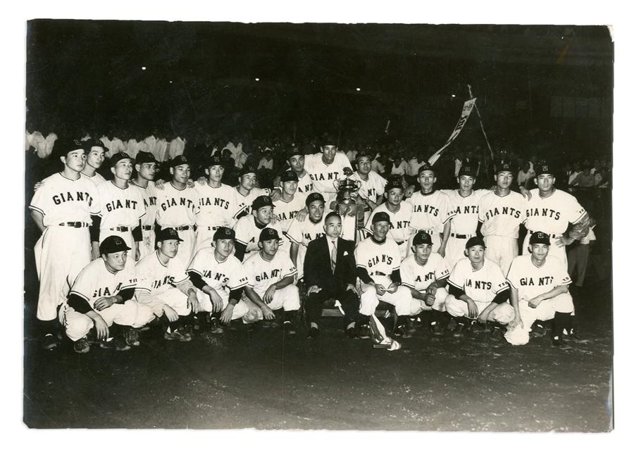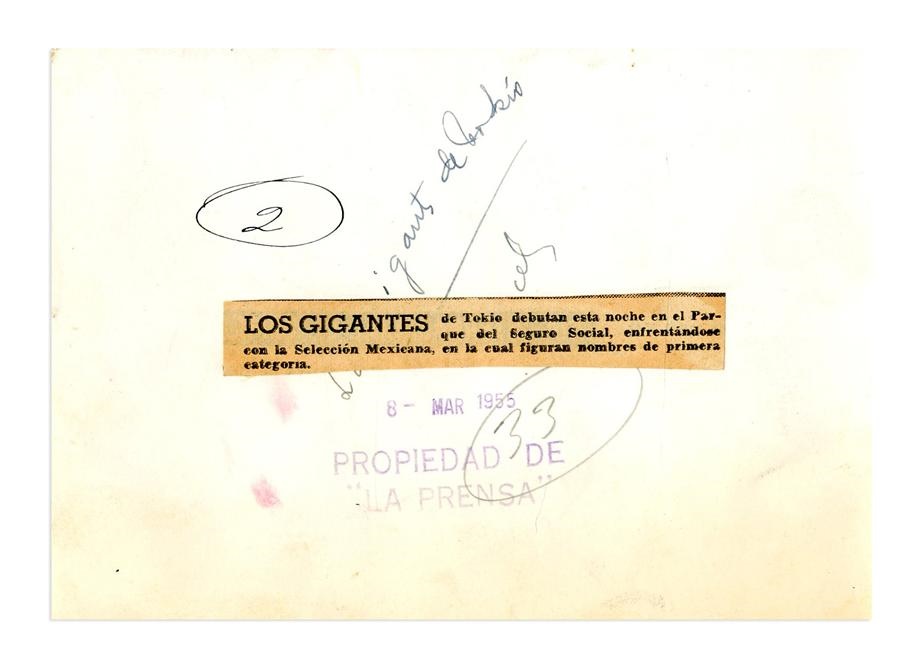 Here's a lovely Type I photo of the 1955 Tokyo Giants during their stay in Mexico in March of 1955 - that mighty team was the Champions of the Japan League that year. Measures 4.5x6.5", with original Mexican archive stamps on verso and newspaper clipping.