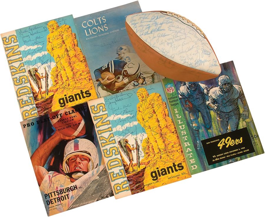Fans of classic football will enjoy this potpourri of six (6) team signed items from 1963-65. Included are: two 1965 Giants programs with 18 team sigs each (Morrall, Wood, Katcavage, Case); a 1963 Lions program with 15 autographs (Lary, Lane, Brown, Morrall); a 1963 Lions program with 20 sigs (Lary, Gonzaga); a 1963 Lions signed program with 30+ autos (Lane, Lary, LeBeau); and last but not least, a 1960s Lions team signed football with over 40 signatures (Lane, LeBeau, Lary). The football shows some fading but most of the sigs remain vividly legible, and the programs average VG-EX condition. A great selection from before the days of the NFL-AFL merger.