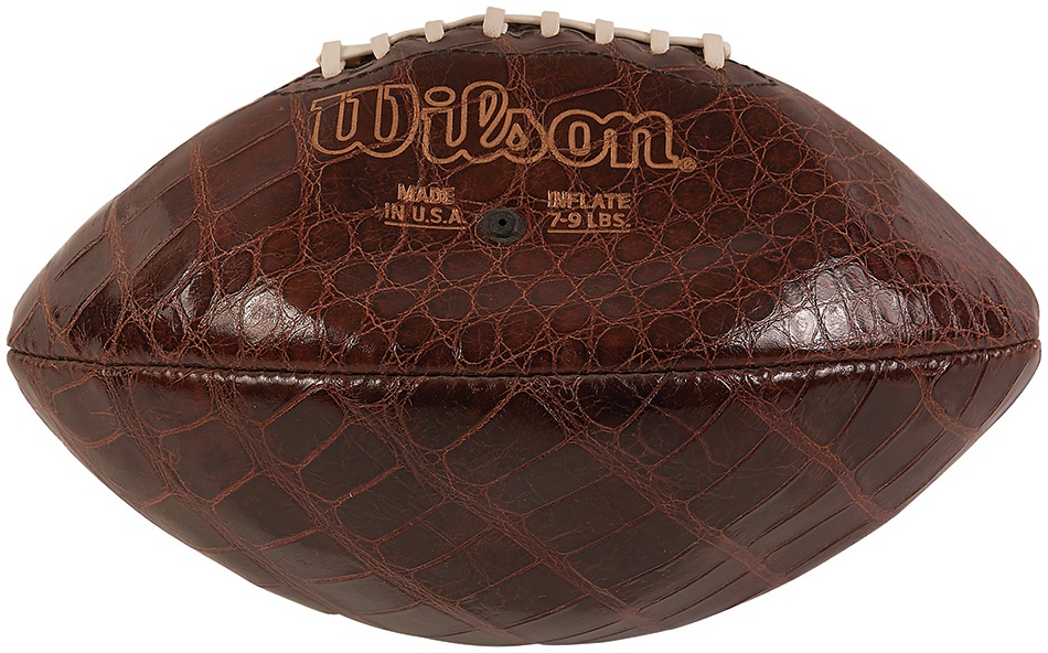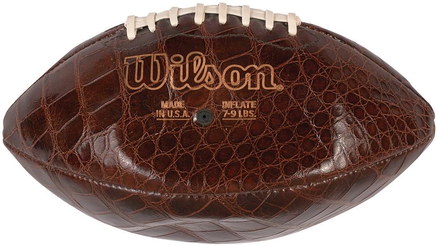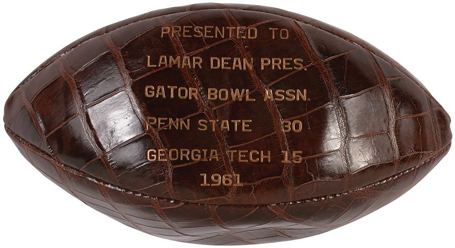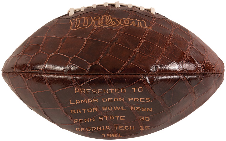 A sight to behold, offered here is an actual ALLIGATOR SKIN football made by Wilson and presented to Gator Bowl Association President Lamar Dean. It was discovered in the trophy room of Dean in a dusty corner. Beautifully engraved in gold "Presented to Lamar Dean Pres. Gator Bowl Assn. Penn State 30 Georgia Tech 15 1961." The ball is basically brand new, right down to the laces and is solid, although the bladder has deteriorated. This looks like one of those multi-thousand dollar women's purses by Birkin, Gucci, or Louis Vuitton. Except a man's version, a football! NRMT condition.