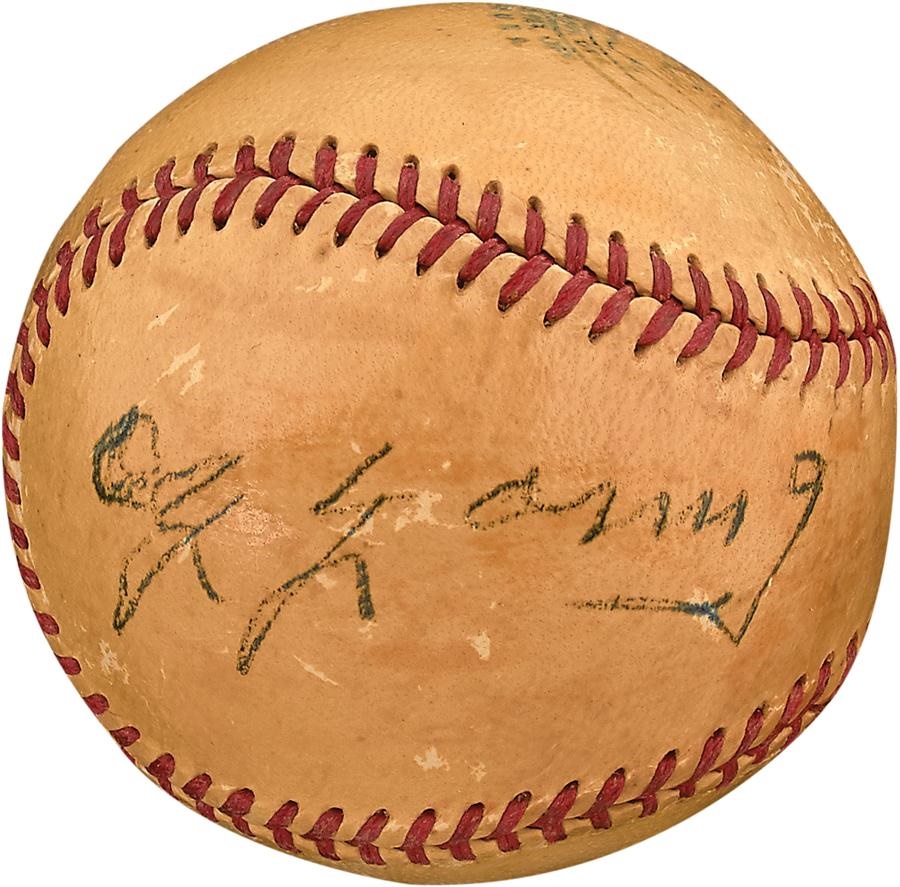 The man for whom the premier pitching award is named - Cy Young - signed this official American League (Harridge) baseball that dates to the early 1950s and boasts a fine example of the Hall of Famer's hand. The ball has been shellacked to preserve the signature, and it is toned to a light yellow because of the coating. The signature on a side panel in black ink rates 7.5/10. Young was the gold standard of pitchers, racking up a record 511 wins (94 more than #2 Walter Johnson) while playing for 22 years. More than a century after his retirement, Cy still holds the major league records of most career innings pitched (7,356), most career games started (815) and most complete games (749). He also suffered 316 losses, the most in MLB history, for fair measure.