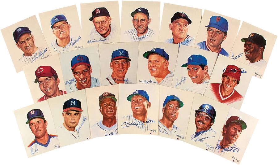 Vibrant and distinctive, this complete set of 20 signed Ron Lewis art cards measure 8x10" and feature signatures from: Mantle, Robinson, Snider, Schmidt, Jackson, Mathews, Ryan, Rose, Koufax, Ford, Spahn, Feller, Mays, Bench, Slaughter, Seaver, Killebrew, Berra, Schoendienst and Drysdale with each signature rating 10/10. They are all limited edition 870/5000. From 1984 to 1995, Lewis' oil paintings of baseball players became instant collectors' items.