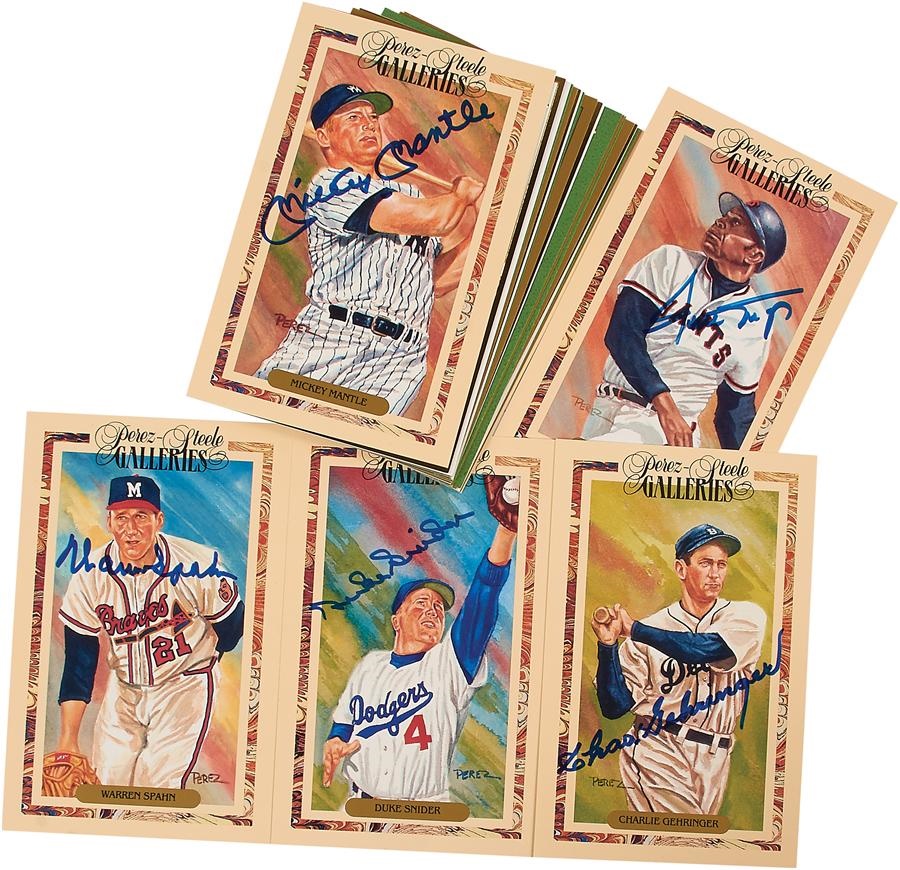 Like a deck of cards, there are 52 Hall of Fame autographs crammed into this terrific lot, including 47 signed HOF postcards from superstars such as: DiMaggio (smudged), Berra, Spahn (2), Mathews, Boudreau (5), Gehringer and Hubbell (2). In addition, there is a complete set of Master Works Perez Steele postcards that include: Mantle: signed one; 5 total, Gehringer: signed one, 5 total; and Mays: signed one, 5 total; Spahn: signed one, 5 total. All LE 1169/10,000.