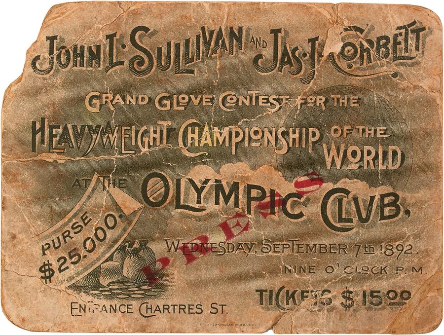 From one of the most famous boxing matches of all-time, this ancient ticket comes from the World Heavyweight Championship bout between John L. Sullivan and "Gentleman" James Corbett in New Orleans on September 7, 1892, during which Corbett won via knockout in the 21st round. The ticket is stamped "Press" on both the front and back, and the condition is rough with a missing top-left corner, creasing, and tears on the left/bottom-right corner. The ticket price of $15 might just get you a beer at a heavyweight match these days.