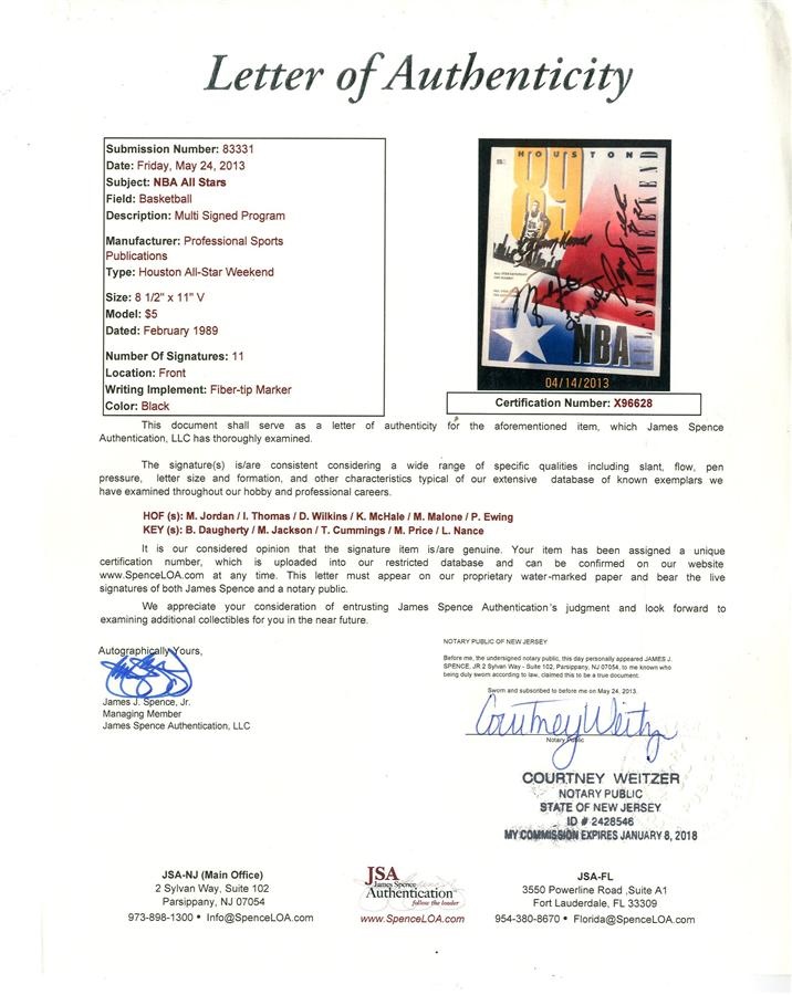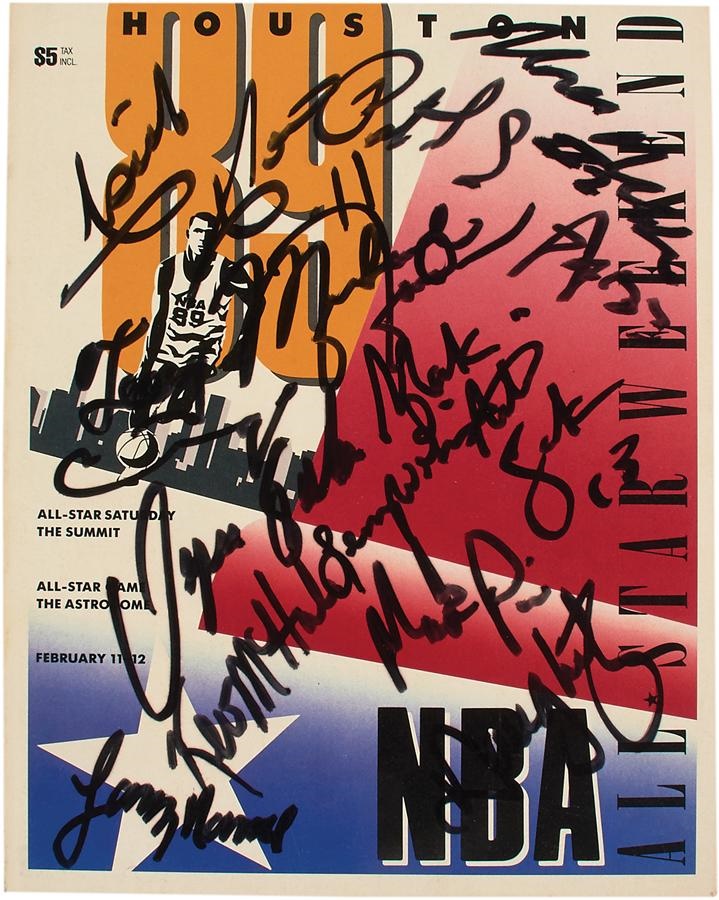 Very tough to find, this team signed 1989 NBA All Star Game Official Program is inked by 11 legends including Michael Jordan. Each has signed on the front of the program in bold black and the Jordan signature is a beautiful example of an early vintage autograph. Additional signers: Patrick Ewing (tough), John Stockton, Dominique Wilkins, Kevin McHale, Moses Malone, Isiah Thomas, Brad Daugherty, Mark Jackson, Terry Cummings, Mark Price and Larry Nance. The program is in top shape with no tears, and comes with JSA LOA that has the wrong picture but correct description.