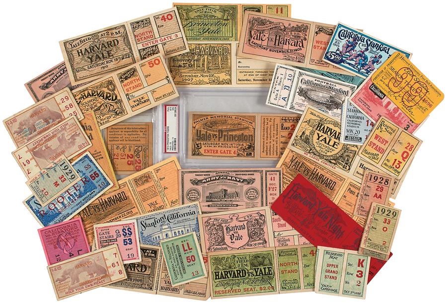 Get your tickets here!!! Count 'em - 146 tickets and ticket stubs from various football games from roughly the first half-century as a competitive collegiate sport. Included here are: 1) Harvard vs. Yale (48): 1881, 94, 98-1929 Including the first Harvard/Yale game at Soldier Field 2) Princeton vs. Yale (18): 1895 (3)-1934 3) Harvard (37): 1896, 98, 99-1936 Including: '21 Harvard/Princeton stub PSA authenticated 4) Stanford vs. Cal (19) 1898-1937 5) Yale (3): 1882, 95-1927 6) Notre Dame (5): 1930-32 7) Army vs. Navy (3): 1926 (3) 8) Other (13): 1927-1936.