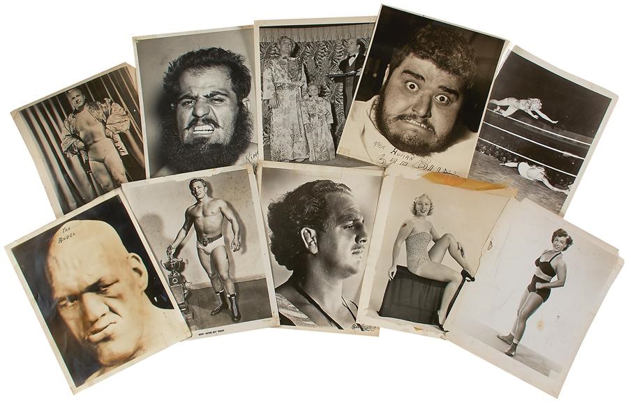 If you're an old-time wrestling fan, this lot is a must-have. A collection of 150 photos dating from 1928-1968 features 125 male, 25 female and three bear photos, including two original 1941 Joe Louis photos, all of which originate from the estate of Tim Nolan, a promoter in the TV professional wrestling industry. Each pic measures 8x10" and some of the notable names are: Gorgeous George, Primo Carnera, Buddy Rogers, BoBo Brazil, Lord Lansdowne Finegan, George Strickland and more.