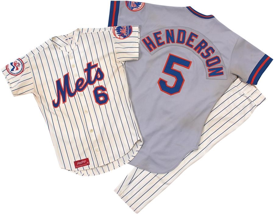Winning the National League pennant last fall has renewed interest in Mets memorabilia. These three jerseys from their late 1970s/Early 1980s down cycle still look good. They are comprised of: a Steve Henderson game worn 1980 Mets jersey, a rare two-button Set 1 with size 42 Rawlings tag and "42 5 80 1" tag in the neck. Also: a Mike Vail game-worn 1976 Rawlings pinstripe jersey with size 40 tag on the tail, Mets and NL Centennial patches on the sleeves and "40 76 6" tag in the neck, and: Lenny Randle game-worn home pinstripe 1978 Mets pants with "31/32 22 78 11" tag, Rawlings size 30 tag and J Mitchell written inside on the pockets and two repairs on the back, one on the front.